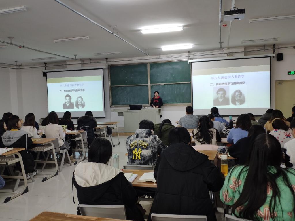 课上,王鑫老师以“德国古典哲学”为主题,从生平简介、经典著作、理论背景和主要观点等方面对西方哲学家费希特的哲学思想进行了重点讲述,详细介绍了他的三条基本原理,自我设定自我、自我设定非我和自我设定自我与非我的统一的思想理论。