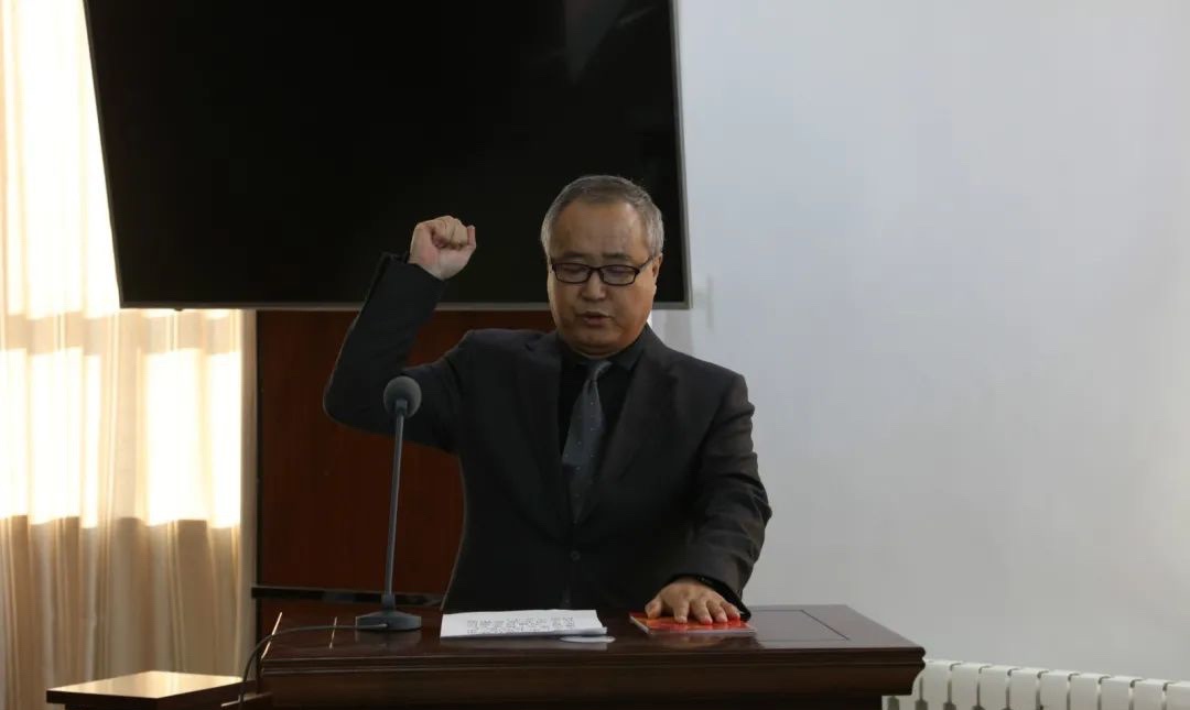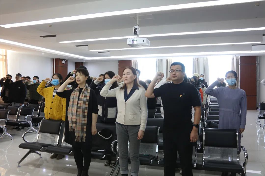 随后,法学院院长马斌带领在场师生进行宪法宣誓,全体师生右手举拳,集体齐声跟诵誓词。