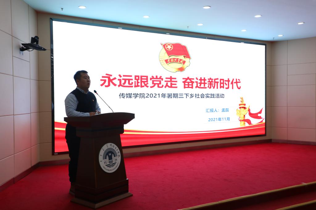 在庄严肃穆的国歌声中,评比汇报会正式开始。在“优秀组织单位”评比环节中,由各学院(团队)相关负责老师对本学院(团队)“三下乡”社会实践活动组织开展整体情况进行汇报。在“优秀实践团队”评比环节中,各实践团队负责人分别从社会实践目的、内容及成果展示等方面汇报了团队实践情况,充分展示出了同学们吃苦耐劳,积极认真的态度,同时也体现出了当代大学生热爱祖国关心社会的优秀品质。最后,郝新君书记进行总结。他在肯定各学院实践成果的基础上,对活动开展和总结提炼方面提出了改进建议。
