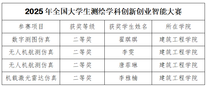 近日,2025 年全国大学生测绘学科创新创业智能大赛在激烈角逐后圆满落幕。作为全国测绘学科领域极具权威性与影响力的赛事,本次大赛吸引了全国近400所高校的7000余名学子同台竞技,集中展示了当代大学生在测绘科技创新领域的前沿探索与实践成果。永利yl23411集团官网建筑工程学院12名学子凭借扎实的专业素养与创新思维脱颖而出,在多个赛道崭露头角:数字测图仿真赛道斩获二等奖1项,无人机航测仿真赛道喜获二等奖2项,机载激光雷达仿真赛道再添二等奖1项。