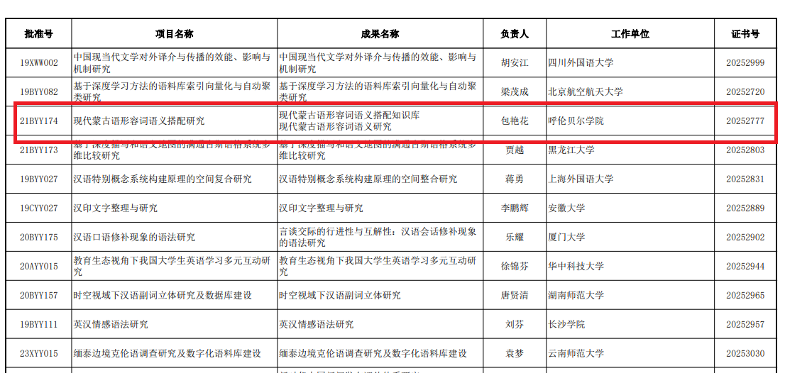 近日,永利yl23411集团官网蒙古学学院包艳花教授主持的国家社科基金项目《现代蒙古语形容词语义搭配研究》成功通过结项评审,获评“优秀”等级,为蒙古语语言资源建设贡献了重要成果。