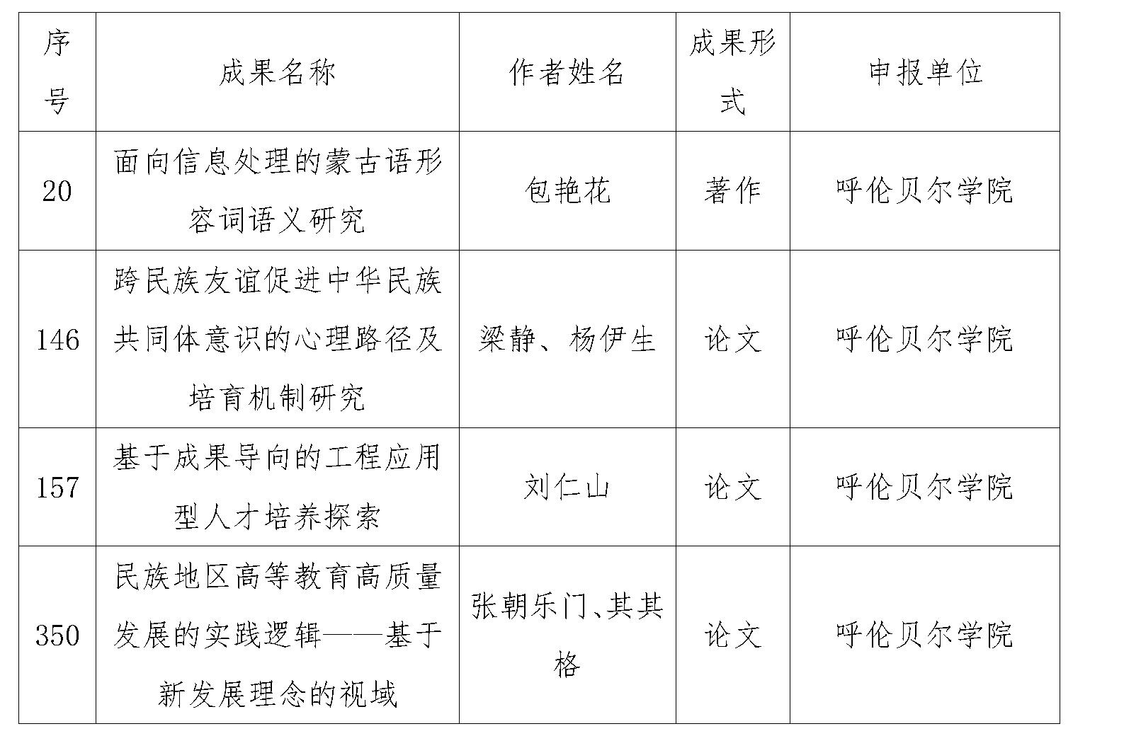 第十一届内蒙古自治区哲学社会科学奖复评公示结束,永利yl23411集团官网包艳花教授申报的著作《面向信息处理的蒙古语形容词语义研究》、刘仁山教授申报的论文《基于成果导向的工程应用型人才培养探索》、梁静副教授申报的论文《跨民族友谊促进中华民族共同体意识的心理路径及培育机制研究》、张朝乐门副教授申报的论文《民族地区高等教育高质量发展的实践逻辑——基于新发展理念的视域》经自治区资格复审、复评,入围第十一届内蒙古自治区哲学社会科学优秀成果奖。