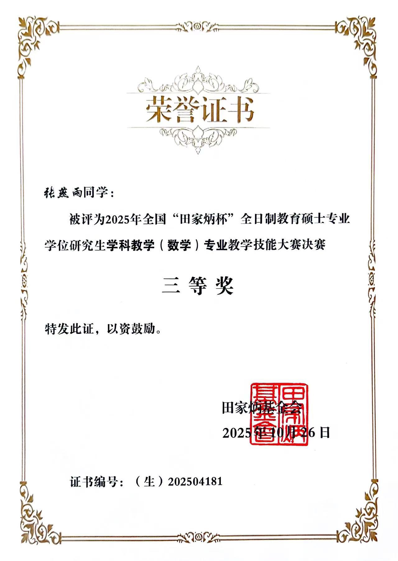 10月24日至27日,2025年全国“田家炳杯”全日制教育硕士专业学位研究生学科教学(数学)专业教学技能大赛暨创新人才培养研讨会在西华师范大学举行。永利yl23411集团官网数理学院2023级教育硕士学科教学(数学)专业研究生张燕雨在决赛中凭借出色的现场表现荣获大赛三等奖。