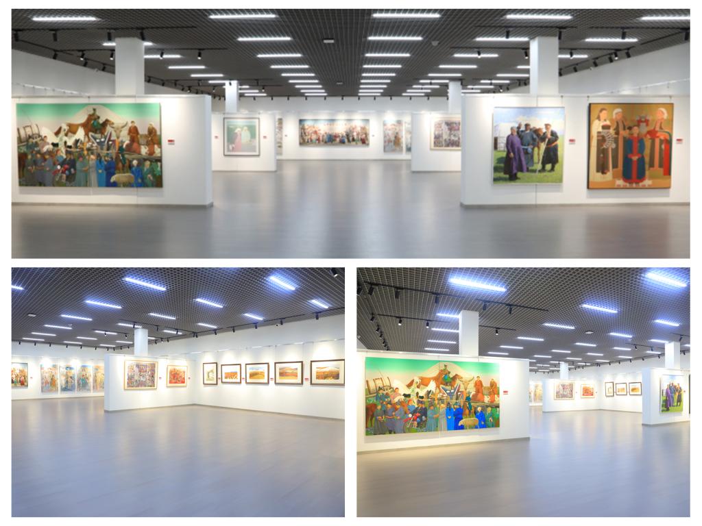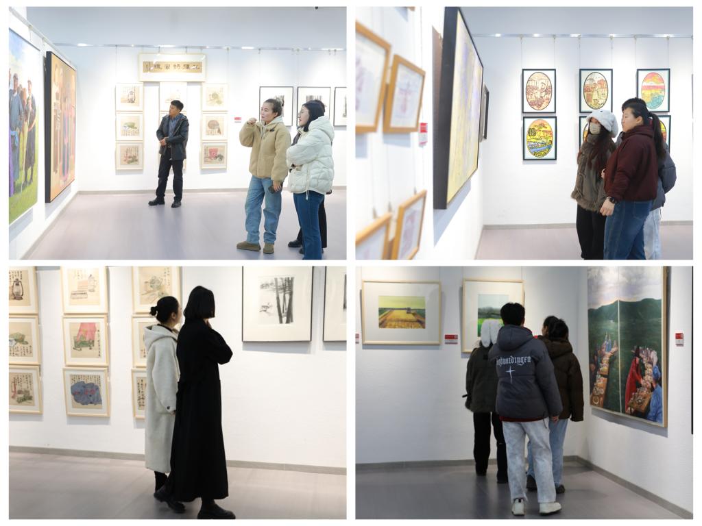 开幕式后,与会嘉宾与师生代表共同参观展览,沉浸式感受北疆文化的独特魅力。本次展览以“风华北疆·美在融合”为主题,将呼伦贝尔的红色记忆、戍边精神、产业史诗与生态哲思熔铸于画布之上,构建起北疆文化的视觉图谱。