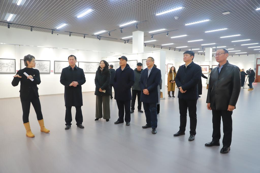 张玉柱宣布展览开幕并致辞。他表示,呼伦贝尔学院积极承担文化传承使命任务,不断搭建学术载体与实践平台。艺术类学科以服务区域文化发展为使命,将学术研究与北疆大地的文化肌理紧密相连。未来,学校将以此次展览为起点,持续强化艺术类学科文化传承的核心引领作用,深化北疆文化的学理化研究和艺术化表达,挖掘更多未被关注的文化符号;推动创作成果的多元化转化,让北疆文化通过画作、设计、文创、雕塑等更多载体走出去。呼伦贝尔学院将不断扩大学校服务社会的影响力,为文化传承创新注入新活力。