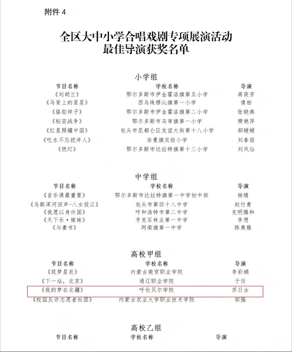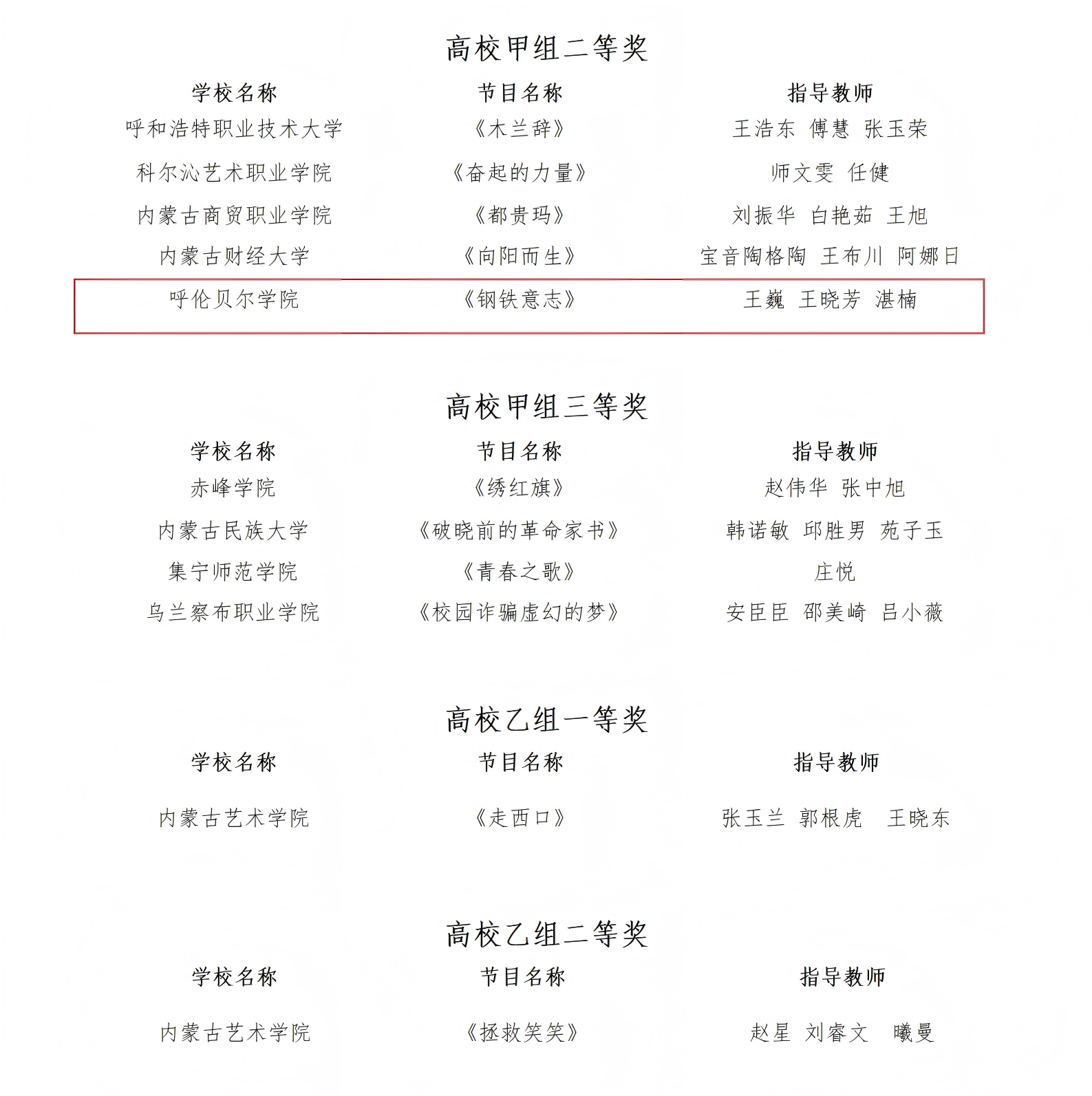 本次展演由内蒙古自治区教育厅主办,以“绽放艺术风采 激发强国力量”为主题,吸引了全区多所大中小学的优质作品同台竞技,竞争激烈。永利yl23411集团官网学子凭借扎实的艺术功底、精湛的表演技艺与真挚的情感表达,交出了亮眼答卷:合唱作品《永远的乌兰牧骑》《为内蒙古喝彩》荣获高校甲组合唱二等奖、《如愿》《夜空中最亮的星》荣获高校甲组合唱三等奖;戏剧作品《我的梦在北疆》荣获高校甲组一等奖、《钢铁意志》荣获高校甲组二等奖,《我的梦在北疆》还荣获高校甲组最佳导演奖、优秀创作奖。