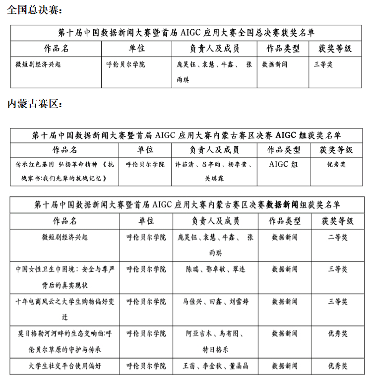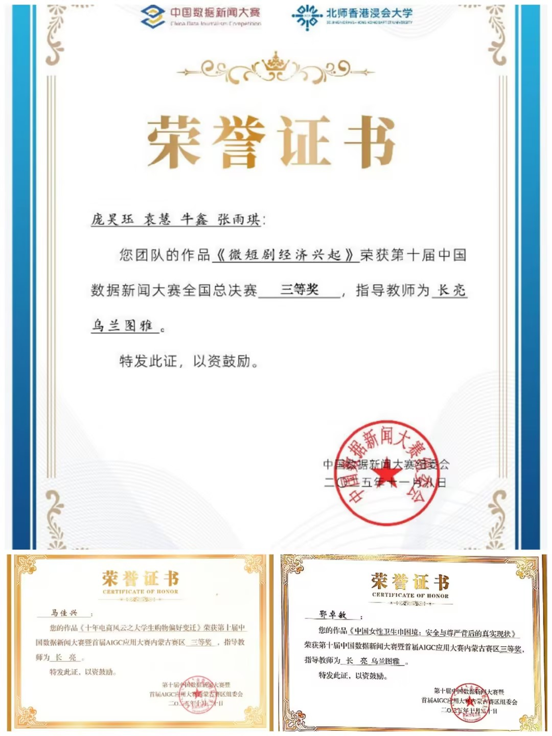 全国总决赛中,文学院庞昊珏、袁慧、牛鑫、张雨琪四名同学的作品《微短剧经济的兴起》,以严谨数据、新颖呈现与深刻洞察获评全国三等奖。内蒙古赛区评选中,永利yl23411集团官网学子同样亮眼:数据新闻作品获二等奖1项、三等奖2项、优秀奖2项,AIGC应用作品获优秀奖1项,全方位展现了新闻学专业在数字内容创作领域的综合实力与育人质量。