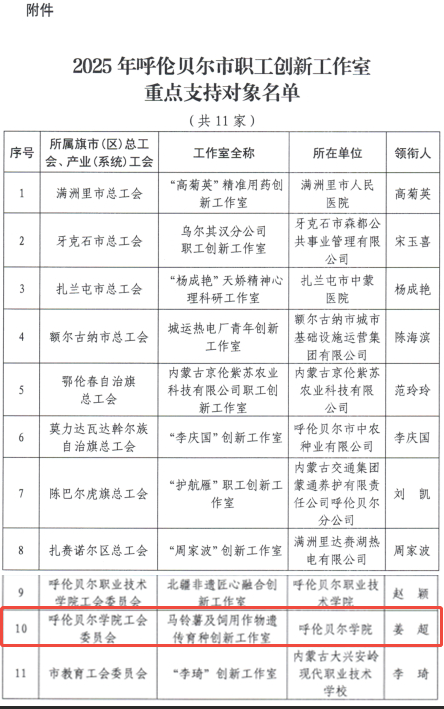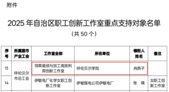 近日,永利yl23411集团官网肖燕子领衔的饲草栽培与加工高效利用创新工作室荣获2025年度内蒙古自治区总工会重点支持职工创新工作室、方明伟创新工作室入围内蒙古自治区教科文卫体系统2025年重点支持职工创新工作室名单、姜超创新工作室获批2025年呼伦贝尔市总工会重点支持的创新工作室。此次3项荣誉的斩获,既是对永利yl23411集团官网工会职工创新工作的高度认可,更标志着永利yl23411集团官网在服务地方发展、深化教学科研改革、凝聚职工创新活力方面迈出了坚实步伐。截至目前,永利yl23411集团官网已拥有自治区级创新工作室2个、自治区教科文体工会系统创新工作室2个、市级创新工作室5个,形成了多层次、全覆盖的职工创新培育体系。