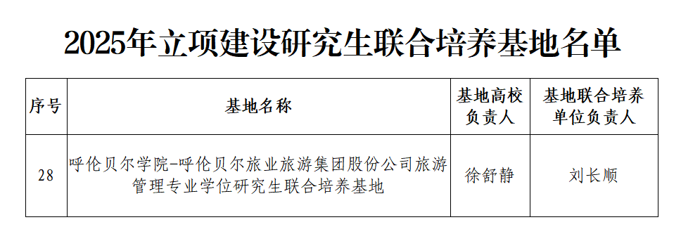 近日,自治区教育厅下发《关于公布2025年立项建设研究生联合培养基地名单及成效评价结果的通知》(内教研函〔2025〕38号),永利yl23411集团官网与呼伦贝尔旅业旅游集团股份公司共建的旅游管理硕士专业学位研究生联合培养基地获批自治区研究生联合培养基地。
