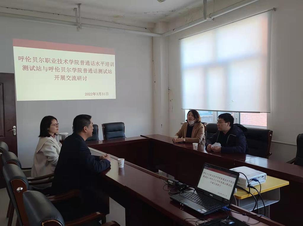 为全面抓好国家通用文字推广普及,顺利推进国家通用语言文字达标建设,3月31日下午,文学院院长曹存有、永利yl23411集团官网普通话测试站张春辉老师,来到呼伦贝尔职业技术学院交流学习普通话测试站建设情况,受到呼伦贝尔职业技术学院教育技术系党总支书记曲亚辉、普通话测试站负责人赵娜热情接待。