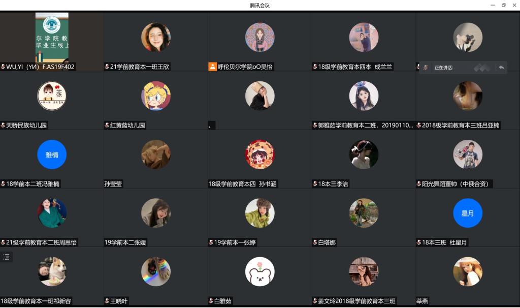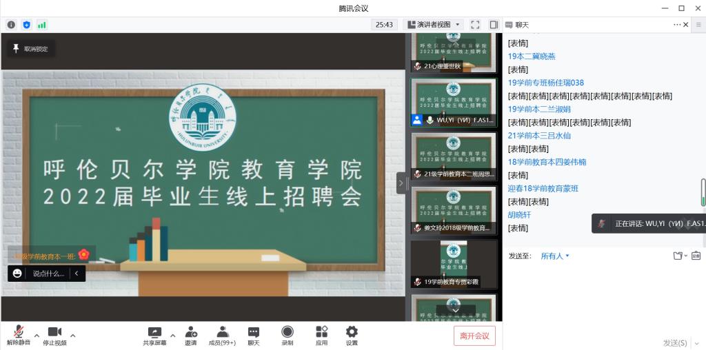 为进⼀步做好毕业生就业工作,为用人单位纳才和毕业生求职搭建“双向选择”平台,4月13日,教育学院在线上开展2022届毕业生招聘会。教育学院党总支书记付刚、党总支副书记海江、各班辅导员老师以及2022届全体毕业生参加,会议由团总支书记吴怡主持。此次招聘会邀请到红黄蓝幼儿园马园长、天骄民族幼儿园园长张红敏、聪明树早教张丹老师以及阳光舞蹈学校董帅老师。