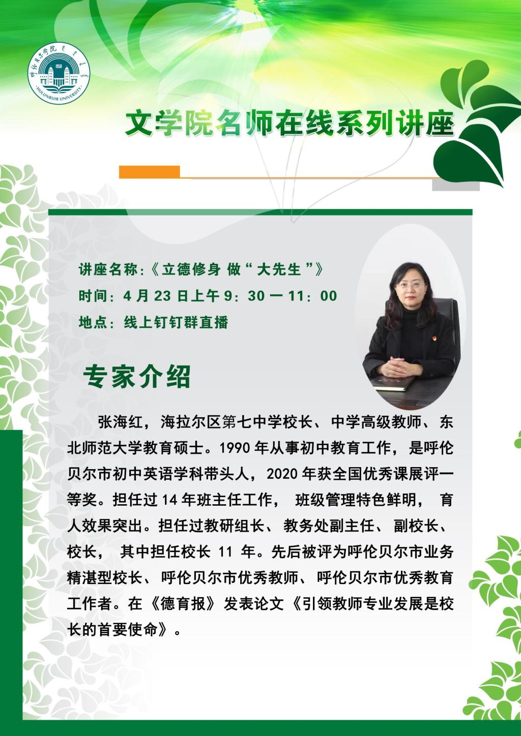 为了进一步提高师范生的师德修养,实现立德树人的目标,4月23日上午,文学院特邀海拉尔区第七中学校长张海红作《立德修身 做“大先生”》专题讲座,本次线上讲座由文学院实训中心主任曲建华主持,文学院副院长蔡文婷及各年级班主任、文学院240余名师范生参加。