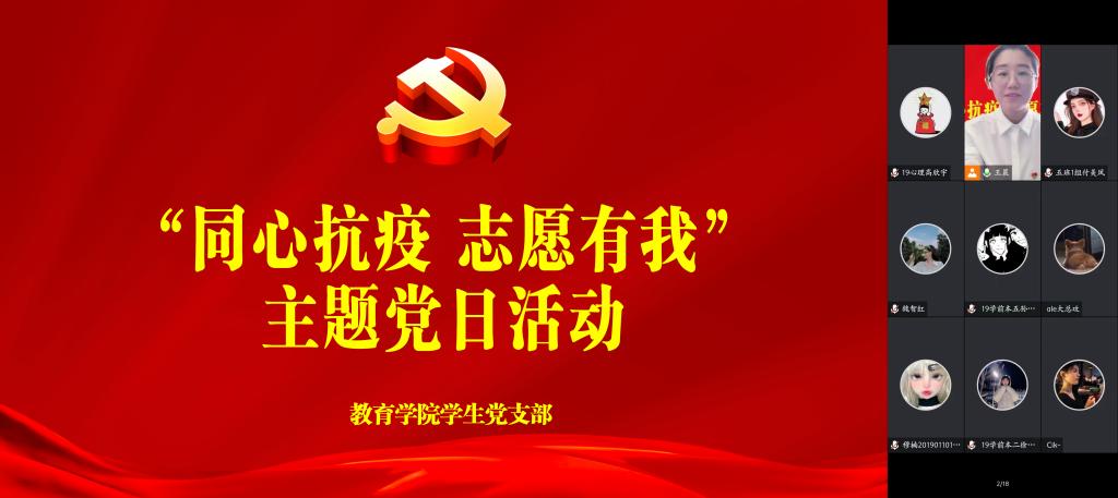 为引导学生党员认真学习疫情防控期间涌现出的典型事迹和感人故事,强化他们的责任感和使命感,4月29日下午,教育学院学生党支部开展了“同心抗疫,志愿有我”线上主题党日活动。教育学院党总支副书记海江、学生党支部全体师生党员参加次会议,会议由教育学院学生党支部组织委员王晨老师主持。