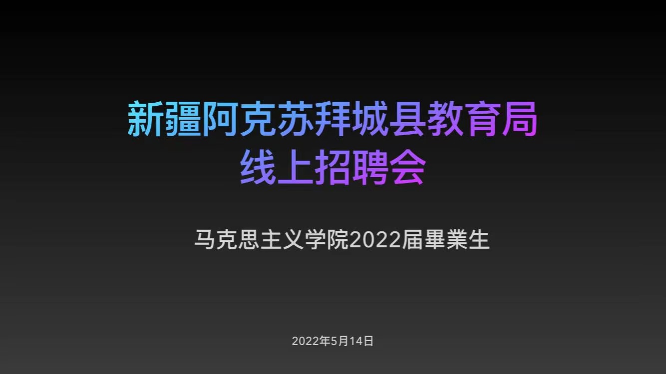 5月14日,马克思主义学院与新疆阿克苏拜城县教育局联合举办线上招聘会。马克思主义学院党总支副书记刘琳、学工办主任张洪海、辅导员查娜及2022届全体毕业生参加了会议。