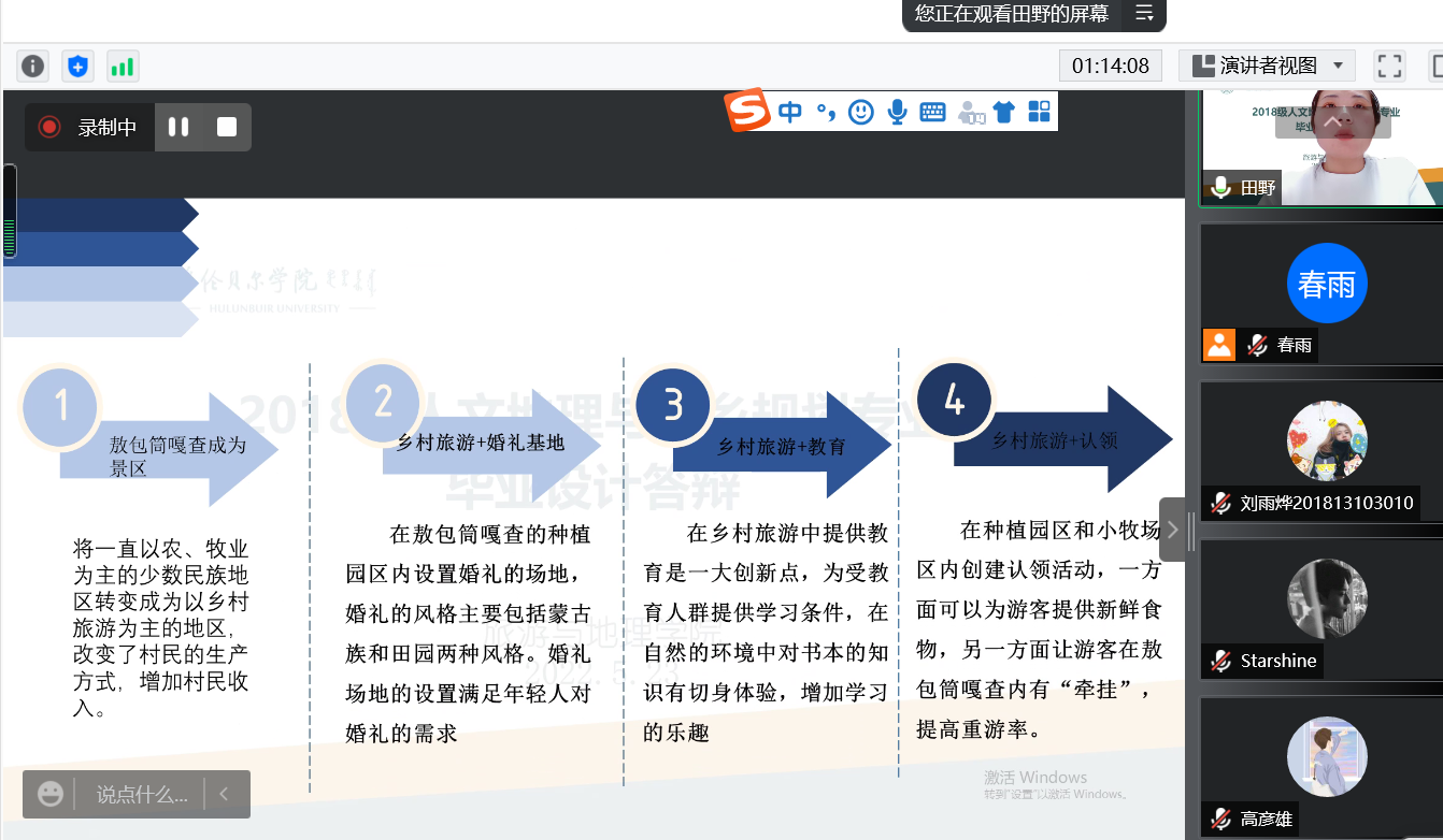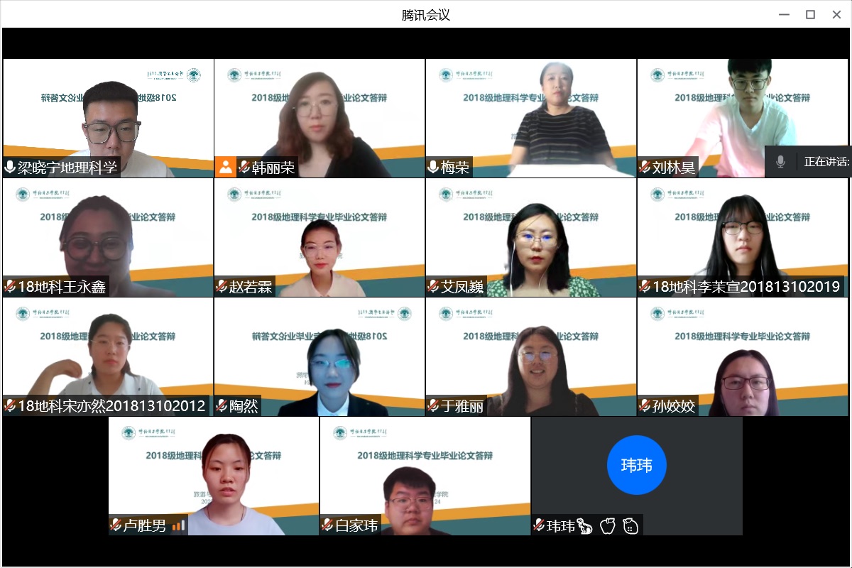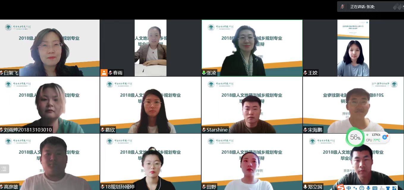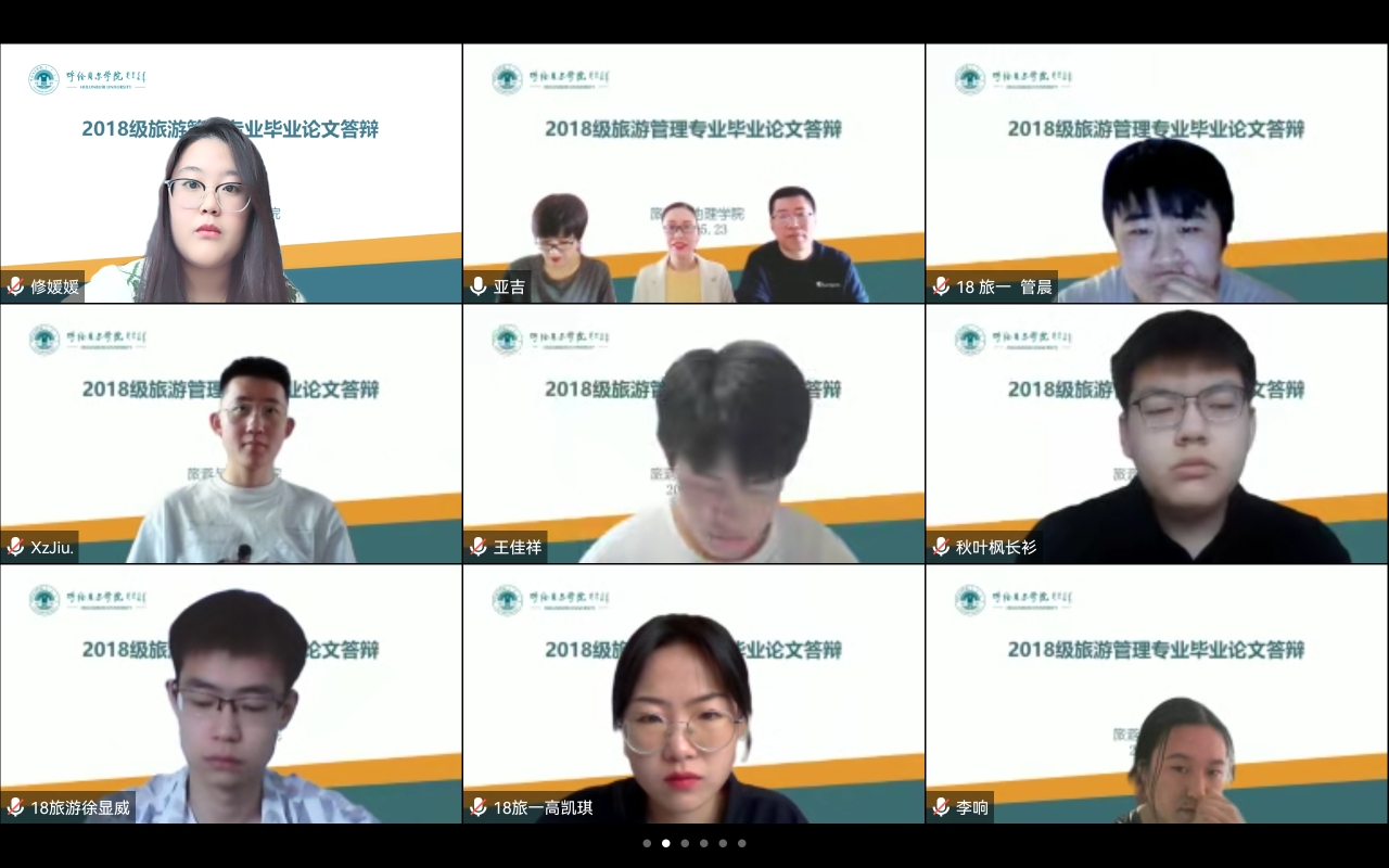 根据人才培养方案要求及《呼伦贝尔学院本科毕业生论文〈设计〉管理规定》,旅地学院在教学院长及各系室主任的安排下,于5.22-5.24日开展并圆满完成了2022届共计195名本科生的毕业论文(设计)线上答辩工作。本次毕业论文(设计)共分为12个答辩组,每组3名答辩老师,共有18名教师参与此次答辩工作。各答辩小组通过听取学生线上汇报、教师提问、学生答辩等环节为本届毕业生的论文(设计)质量把关。
