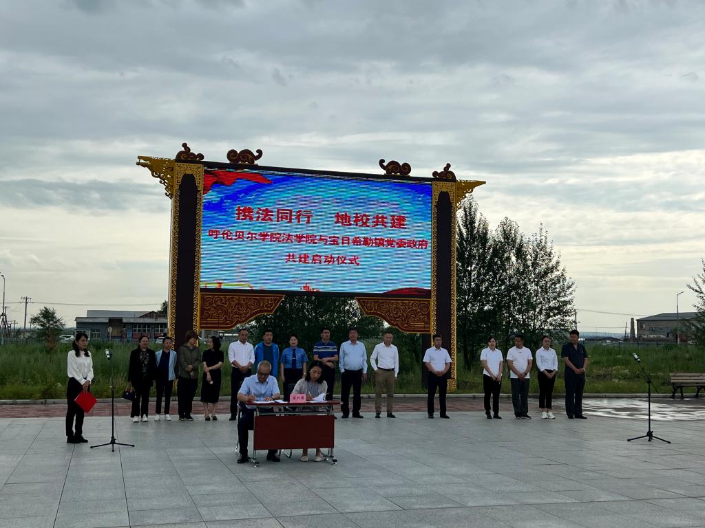 法学院党总支副书记白杰与栓柱书记共同签署了呼伦贝尔学院法学院党总支与中共宝日希勒镇委员会《融合党建协议书》;马斌院长与婧婧镇长共同签署了宝日希勒人民政府与呼伦贝尔学院法学院《共建协议书》,并共同完成揭牌仪式。最后,双方为社区居民进行了细致详细地普法宣传,针对百姓提出的问题进行答疑解惑。