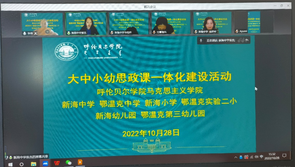 为推进大中小幼思政课一体化建设,强化思想政治教育人才培养的针对性、目标性和连续性,10月28日,永利yl23411集团官网马克思主义学院、新海中学、鄂温克中学、新海小学、鄂温克实验二小、新海幼儿园和鄂温克第三幼儿园齐聚云端,共同举办大中小幼思政课一体化建设活动。