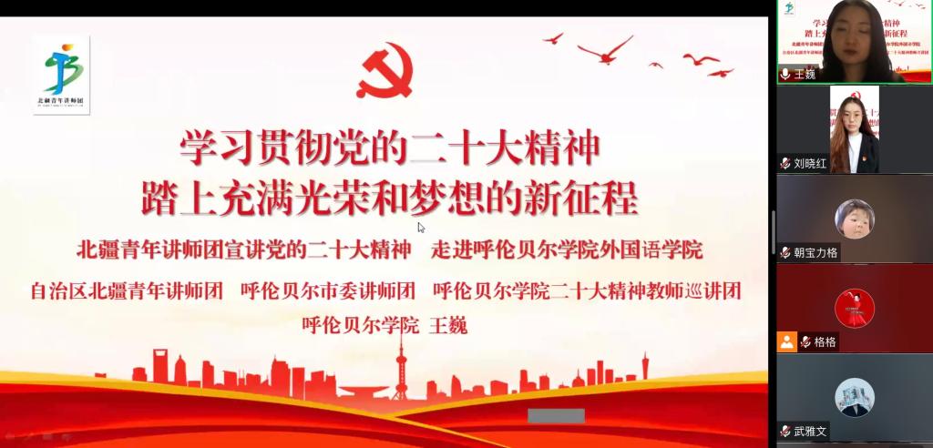 为全面深入学习贯彻党的二十大精神,12月8日,外国语学院党总支在线上开展党的二十大精神宣讲活动,活动邀请呼伦贝尔学院学习贯彻党的二十大精神校园巡讲团成员、外国语学院团学办公室副主任王巍为学院师生宣讲党的二十大精神。学院领导班子成员、全体教职工、全体学生党员及青马班成员等150余人参加。活动由学院党总支书记金鑫鑫主持。