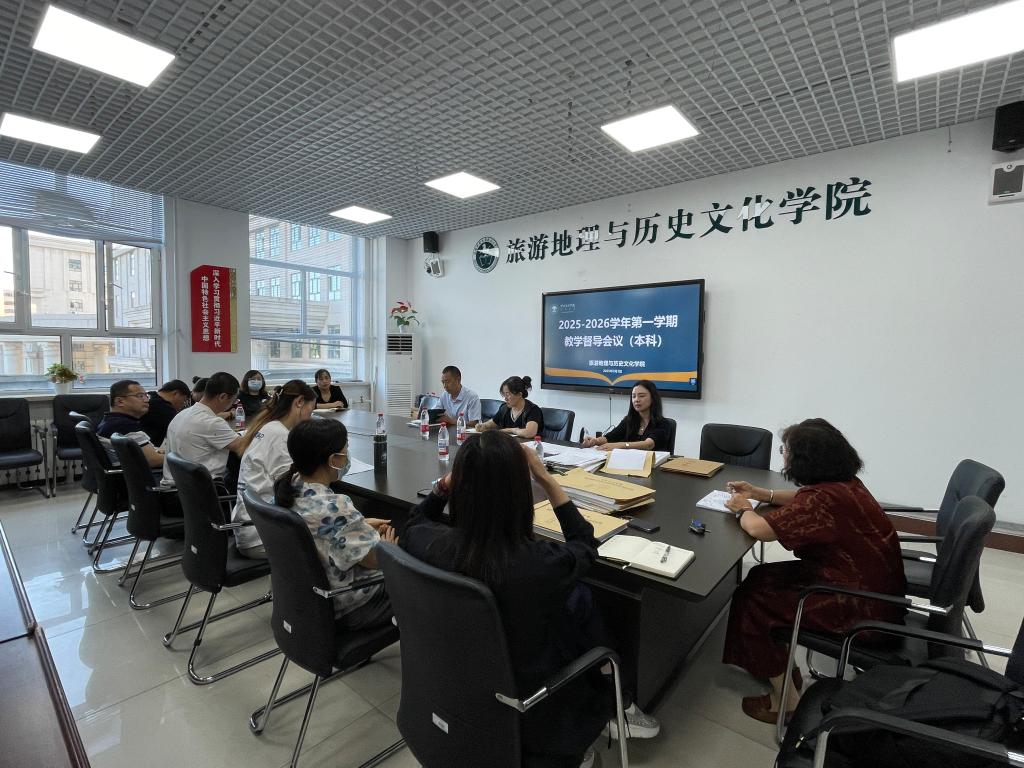 9月3日下午,旅游地理与历史文化学院在崇文楼B321会议室召开2025-2026学年第一学期本科教学督导会议。会议以“锚定审核评估目标,筑牢本科教学质量根基”为主题,由学院副院长徐舒静主持,书记赵金辉、院长白絮飞以及各专业督导教师共同参会,系统部署新学期教学督导工作。