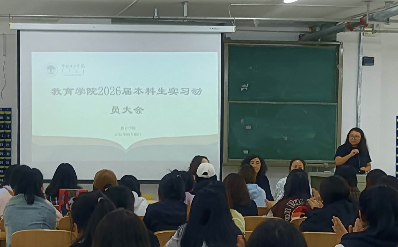 为保证2026届毕业生实习顺利开展,9月5日下午,教育学院在崇文楼B401教室召开实习动员大会。学院党委副书记吴怡、各系主任、实习指导教师、实验实训中心全体教师以及2022级学前教育专业、小学教育专业、教育技术学专业和心理学专业全体学生参会。