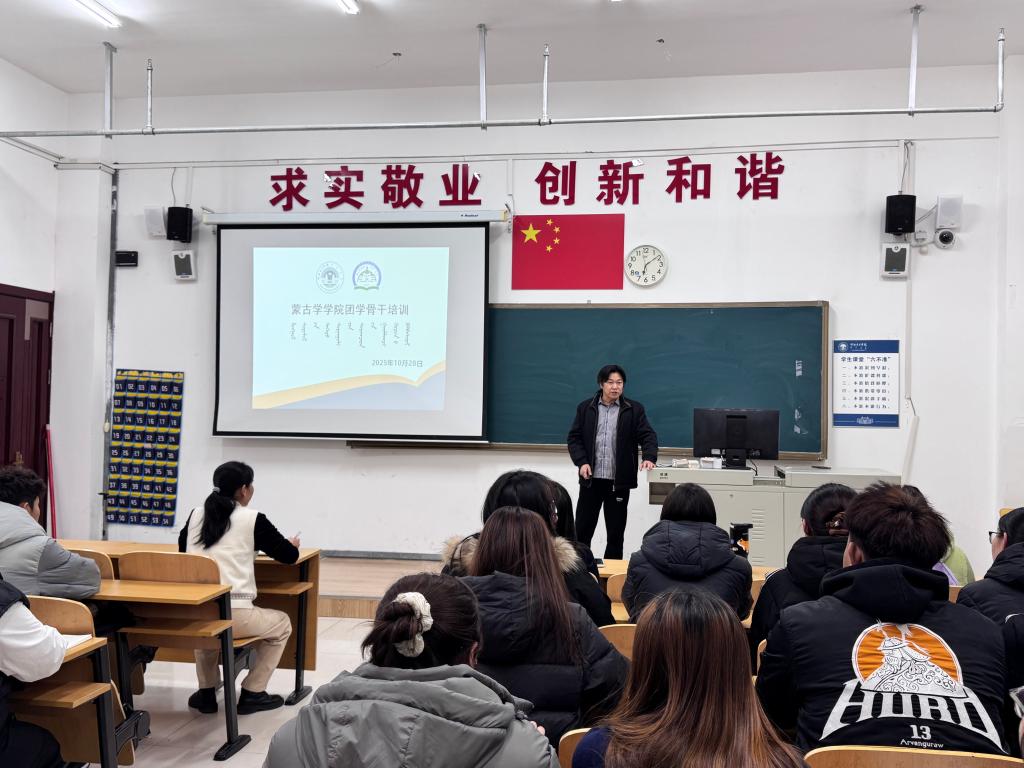 为锻造一支能力过硬、素质优良的团学骨干队伍,10月28日晚,蒙古学学院在崇文楼B209教室开展了团学骨干培训活动。学院党委书记格根塔娜、党委副书记孔春艳及各班班干、学生会、青年志愿者协会、社团及团总支成员等60余人参加活动,团学办主任额尔布乐图主讲。