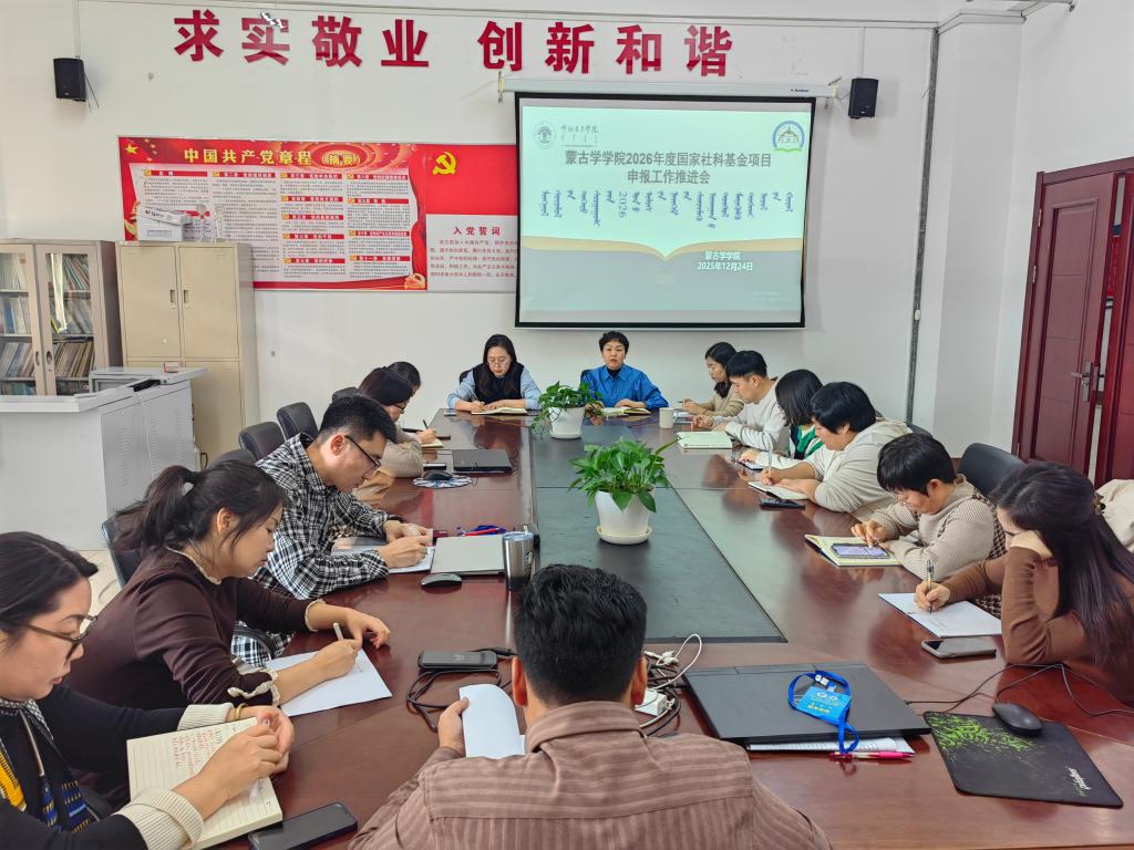 为扎实推进2026年度国家社科基金项目申报工作,提升申报质量与立项竞争力,12月24日上午,蒙古学学院在崇文楼B221会议室召开专题工作推进会。学院领导班子成员、各学科带头人、申报骨干教师及科研秘书等参加会议,学院院长白秀峰主持会议。