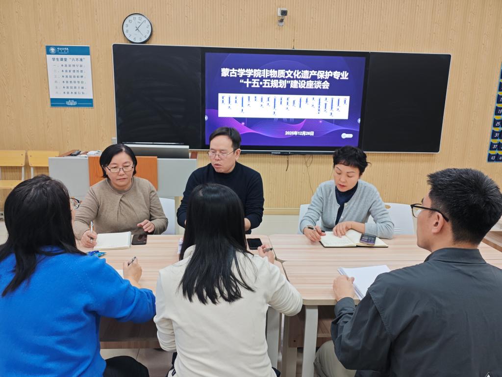 12月26日,蒙古学学院非物质文化遗产专业教师团队在崇文楼B228教室召开“十五五”规划建设专题座谈会。会议由专业负责人青春主持,学院院长白秀峰全程指导,学院非遗专业全体教师参会。