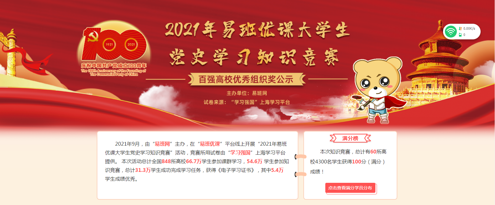 百年恰是风华正茂,奋斗报国砥砺前行。为进一步巩固党史学习教育成效,不断推进党史学习教育走深走实,近日,教育部易班发展中心、易班网依托易班优课平台和“学习强国”上海学习平台,举办了为期一个月的“2021年易班优课大学生党史学习知识竞赛”。全国共848所高校66.7万学生参加课群学习。永利yl23411集团官网党委高度重视此次竞赛。党委宣传部、学生工作处积极组织和发动学生参加竞赛活动,取得了显著的成绩,荣获“2021年易班优课大学生党...