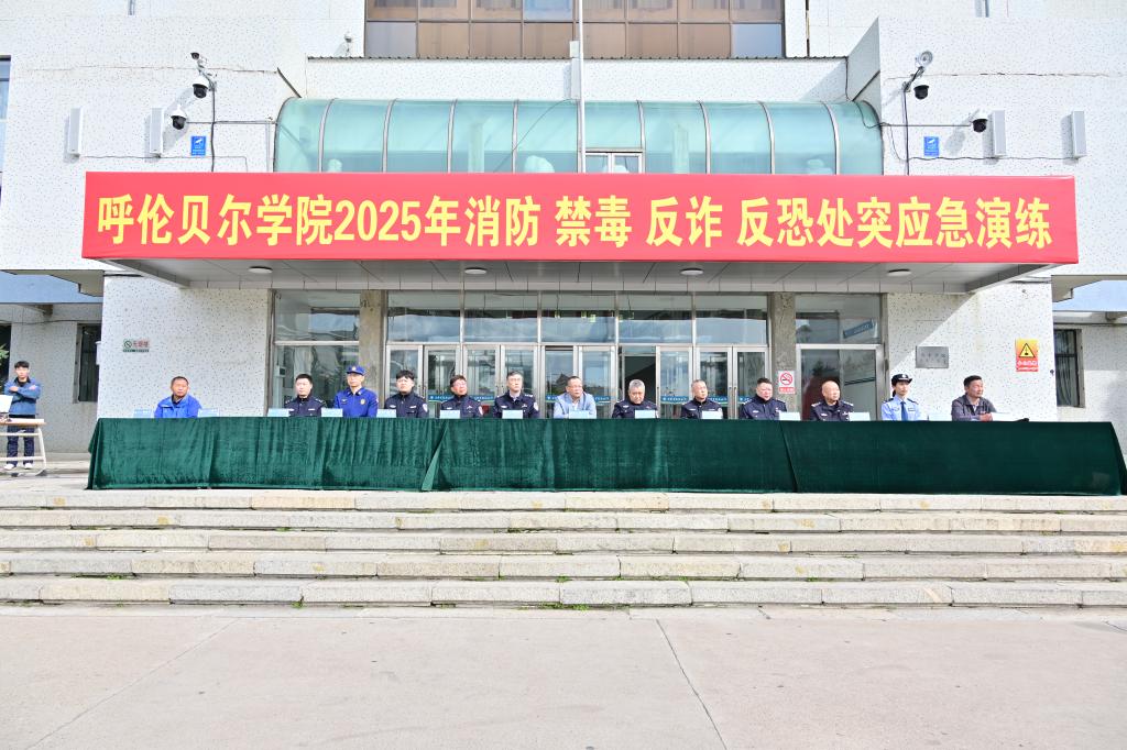 演练有序开展,各环节衔接紧密、实战性强:在消防应急演练中,首先模拟了火灾突发事件,学生们在消防警报声中,用湿毛巾捂住口鼻,沿预定路线快速疏散至安全地带,到达安全地带后,消防员详细地讲解灭火器的使用方法,学校救护医疗队通过现场示范为同学们讲解心肺复苏、海姆立克紧急救治;在反恐处突演练中,海拉尔公安分局反恐怖和特巡警大队模拟“恐怖分子”闯入校园场景,特警队员迅速制服了“歹徒”,并展示了破八刀和刀功持枪技术,随后呼伦贝尔学院义警队带来警务技能联合展演;在高空救援演练中,消防部门启用70米登高平台消防车,模拟登高救人场景,救援人员精准操作设备完成高空救人,直观展现消防队伍的专业素养与团结奉献精神;开展禁毒与反诈宣传,海拉尔公安分局禁毒大队工作人员对同学们发放宣传海报及手册,并邀请同学们近距离参观毒品模型,讲解毒品危害与辨识方法,同时,呼伦贝尔市公安局工作人员进行了反诈宣传工作,呼吁同学们共同抵制买卖“两卡”行为,维护社会平安。