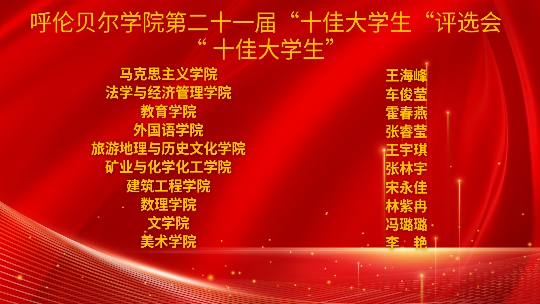 经评审,最终评定呼伦贝尔学院第二十一届“十佳大学生”10名、“十佳大学生”提名奖6名。