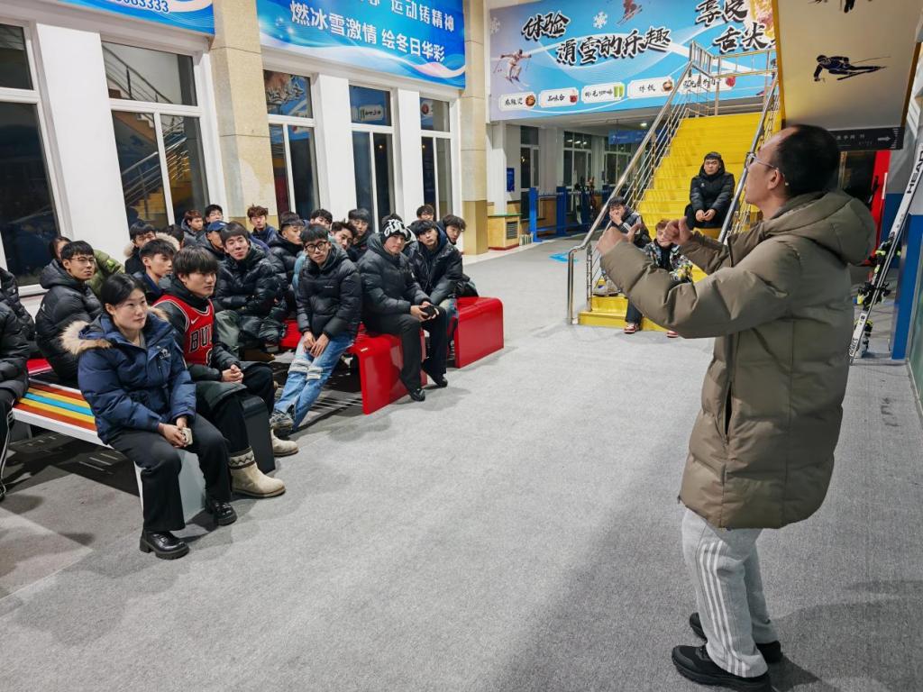 课程教学在传承经典模块的基础上实现全面升级。开课前,教师团队不仅详细讲解雪具使用、滑行姿势、安全防护等基础内容,还新增“滑雪定向”等融合教学模块,将民族传统体育元素与冰雪运动巧妙结合。形成“理论教学+实战指导+科研保障”的复合型教学团队,为学子提供分层分类的个性化指导。