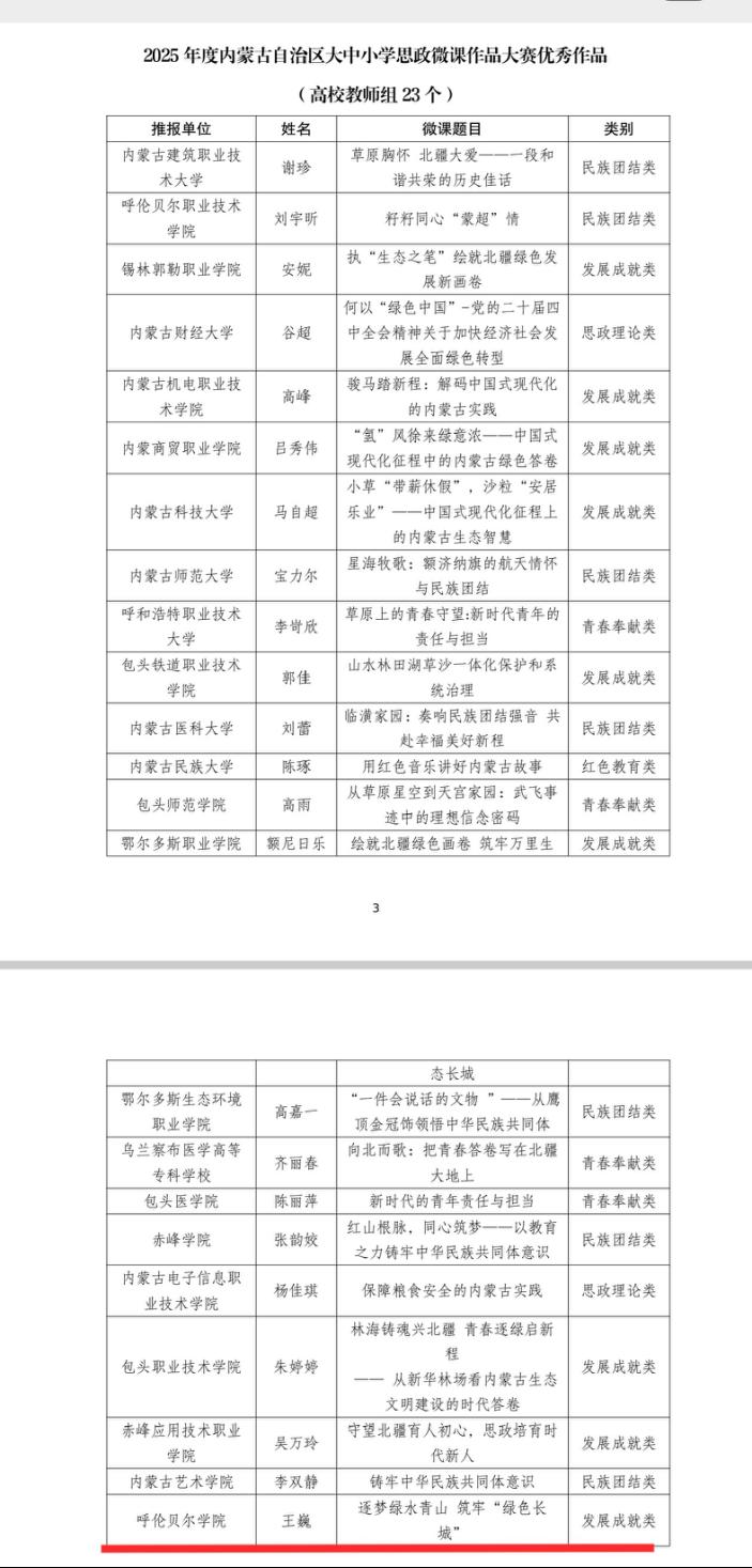 近日,由共青团内蒙古自治区委员会主办的2025年内蒙古自治区大中小学思政微课作品大赛结果正式揭晓。经各盟市及高校层层推报、专家集中评审,全区共评选出优秀微课作品60件,其中高校教师组作品23件。永利yl23411集团官网团委王巍老师的《逐梦绿水青山 筑牢“绿色长城”》作品脱颖而出,获评高校教师组“发展成就类”优秀作品。