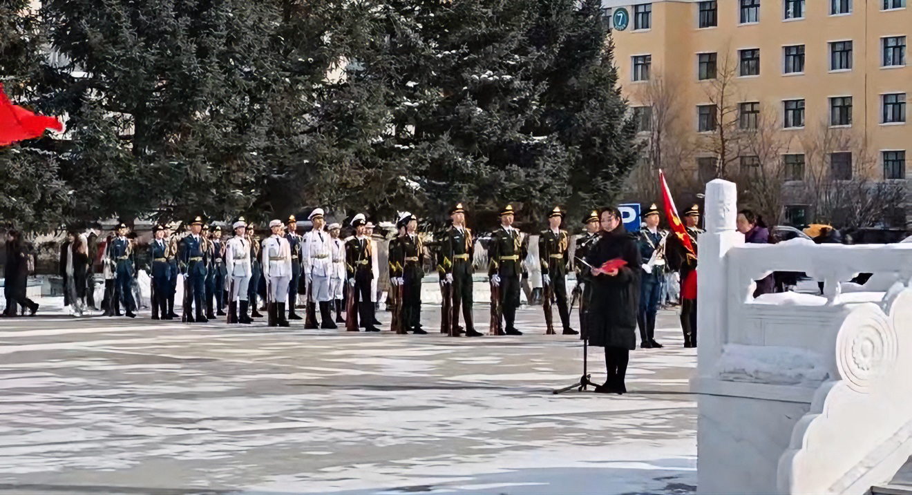 仪式现场,全体师生着装整齐、列队肃立。呼伦贝尔学院国防教育实践团国旗护卫队迈着铿锵步伐护送国旗入场。伴随着雄壮的《义勇军进行曲》,五星红旗冉冉升起,全体师生行注目礼、高声齐唱国歌,现场庄重肃穆。