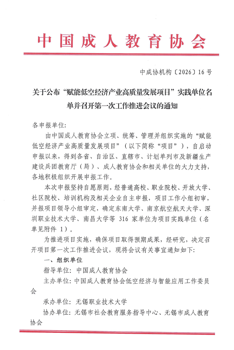 本次项目由中国成人教育协会立项统筹,低空经济与智能应用工作委员会具体实施,旨在汇聚高校、职业院校、企业等多方资源,构建低空经济人才培养标准体系,打造集课程研发、实训实践、认证评价于一体的产业人才培育生态。