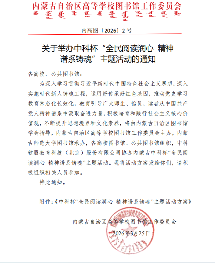 2.第二阶段——在第一阶段成功积累满150分的参与者,将获得进入线上知识竞赛的资格。竞赛将根据答题的正确率以及用时进行综合评分,确保评选结果的公平、公正、公开。获奖者将获得由内蒙古自治区高等学校图书馆工作委员会颁发的荣誉证书,以资鼓励。活动时间为2026年4月1日8:00至4月30日24:00。