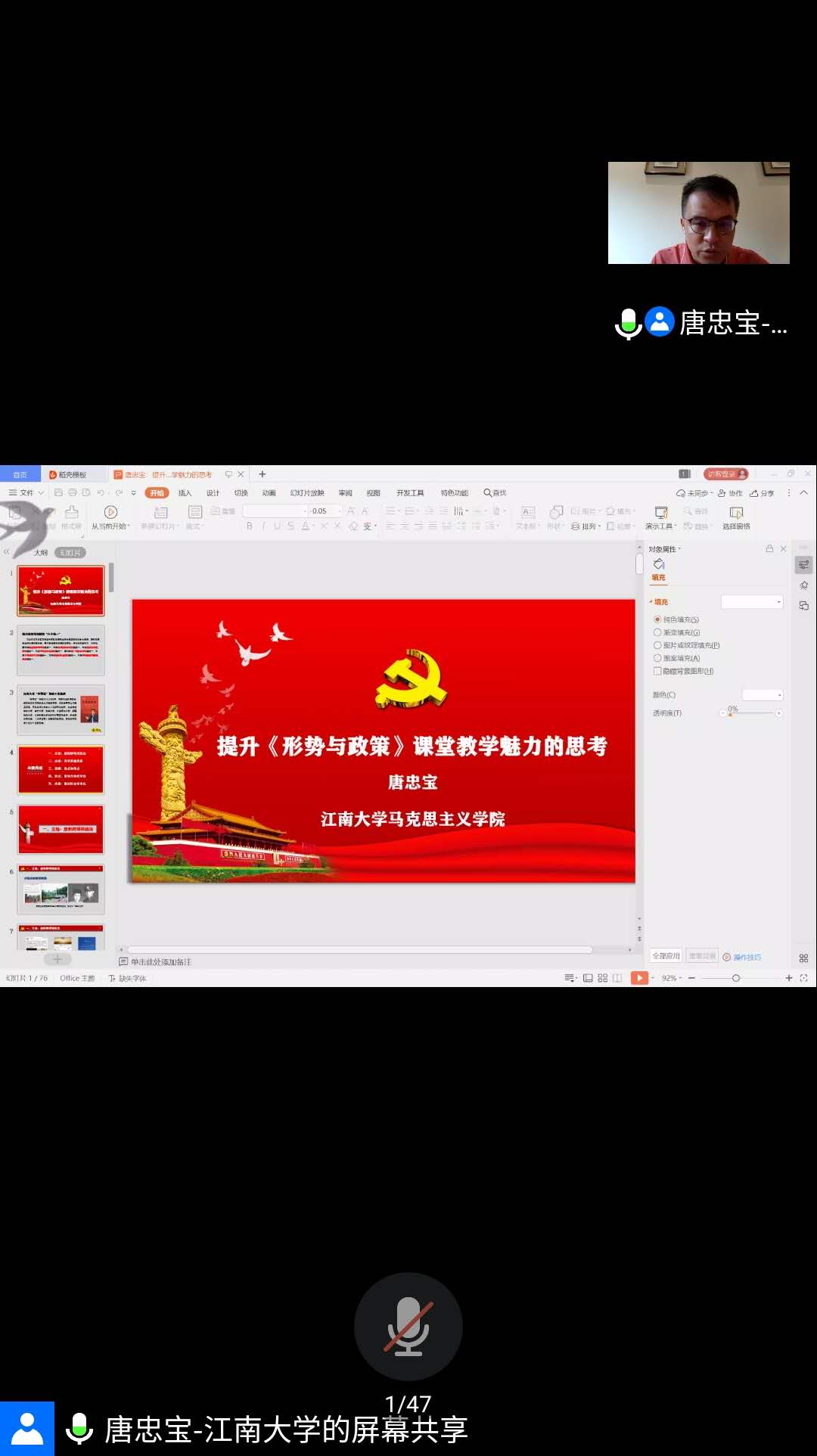 7月7日下午,马克思主义学院“形势与政策”课程组教师通过腾讯会议参加了由内蒙古师范大学主办的内蒙古思政课教师同备一门课——形势与政策课线上集体备课活动。本次活动聘请了江南大学马克思主义学院教授、哲学博士,教育部首批思政工作精品项目“宝哥说”思政文化育人品牌主讲人唐忠宝教授作了题为“提升《形势与政策》课堂教学魅力的思考”的精彩讲座。