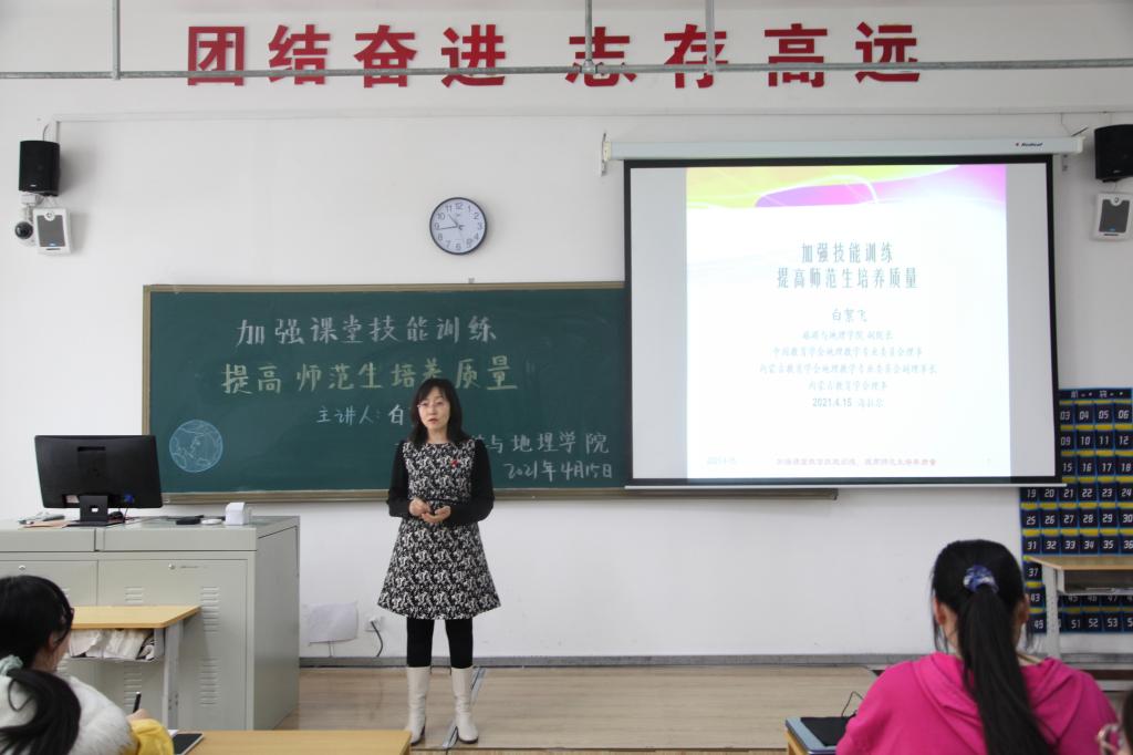 为提高师范生培养质量,更好地完成师范专业认证准备工作,4月15日,旅游与地理学院副院长白絮飞教授在崇文楼B座331教室开展了“加强课堂技能训练,提高师范生培养质量”的专题讲座,讲座围绕师范生职业意识、师范生必须掌握的教育教学技能展开,旨在培养未来合格的人民教师。