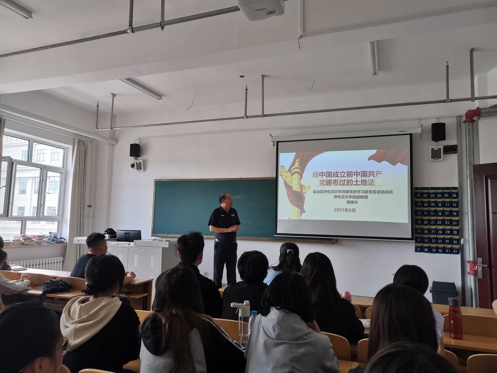 6月9日下午,法学院在崇文楼B425邀请自治区呼伦贝尔市党委党史学习教育宣讲团成员、历史文化学院副教授黄福令为法学院宣讲团学生开展题为《新中国成立前中国共产党颁布过的土地法》专题讲座。同时邀请校党委宣传部理论教育科科长白玫老师为宣讲团成员进行宣讲指导。法学院党总支副书记白杰主持会议。法学院宣讲团全体成员参加。