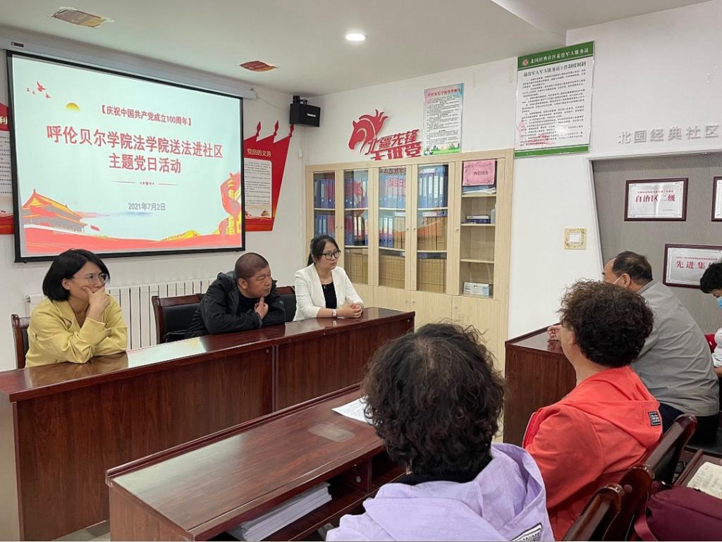 为庆祝中国共产党成立100周年,深入贯彻落实《呼伦贝尔学院党史学习教育“我为群众办实事”实践活动工作方案》,开展“我为群众办实事”实践活动。7月2日,法学院教师党支部组织教师党员开展“送法进社区”主题党日活动。