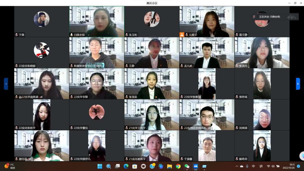 为学习贯彻党的二十大精神,化学化工学院于10月26日晚召开线上“学习党的二十大报告精神”团日活动。本次活动由团学办公室副主任、团总支书记闫微主持,学院第八届团总支,学生会全体成员,社团负责人,各班级团支部书记,新发展团员共45人参加。