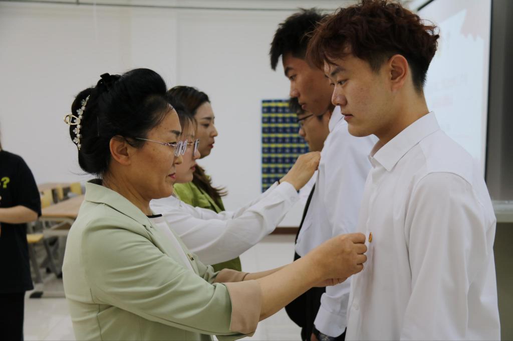 随后,党总支副书记毕瑞金、团总支书记闫微和老团员代表文静为新团员佩戴团徽。出团旗、唱团歌,新团员在团旗下进行了庄严的宣誓,新团员代表周浩天号召学生们严格要求自己,不忘初心、砥砺前行。老团员代表文静向新团员致以诚挚的祝贺和美好的祝愿。
