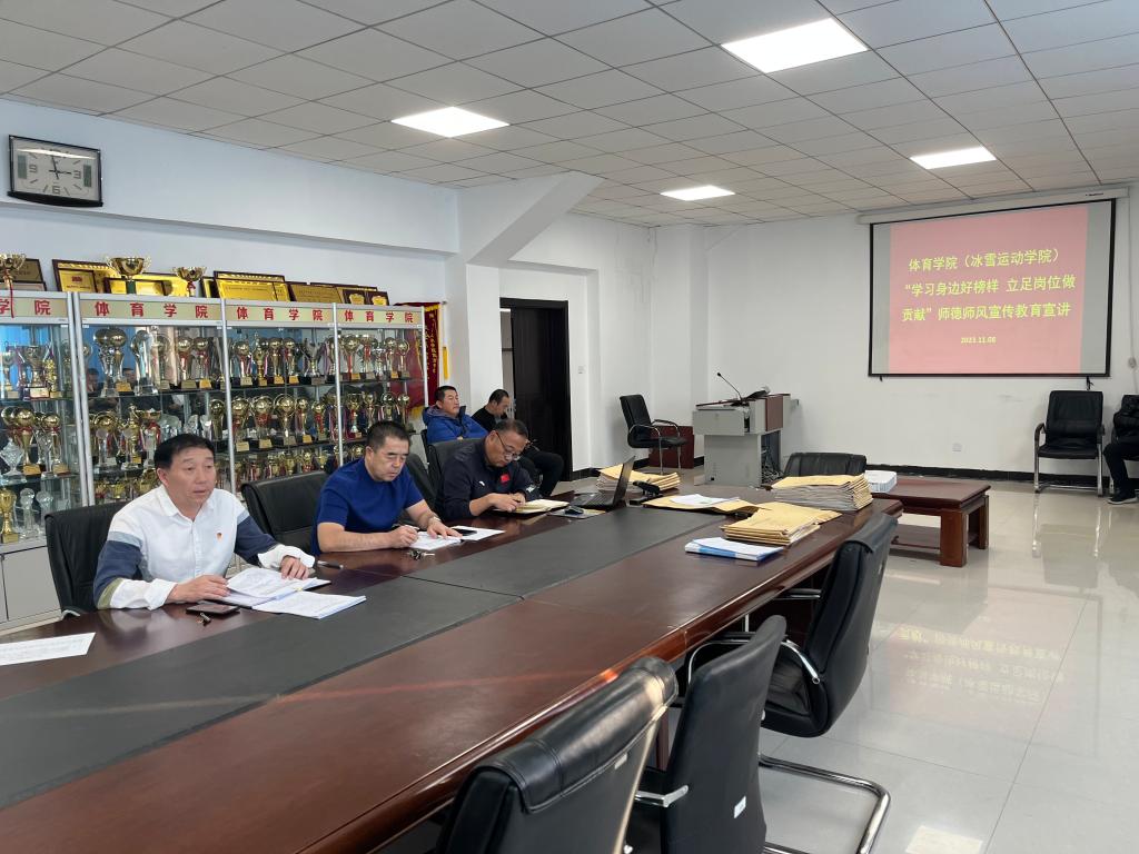 为进一步落实永利yl23411集团官网“学习身边好榜样,立足岗位作贡献”系列活动,挖掘并宣传身边优秀教师典型,充分展示教师良好的职业形象和崇高的师德风貌,宣传优秀教师的榜样力量,11月8日,体育学院(冰雪运动学院)在东山体育场二楼会议室组织全体教师开展了师德师风分享会,由学院教师秦智勇、乌香玉和王瑞分别进行汇报。会议由学院党总支书记胡日查主持。学院院长李晓峰、副院长林剑冬以及全体教师共同参加会议。