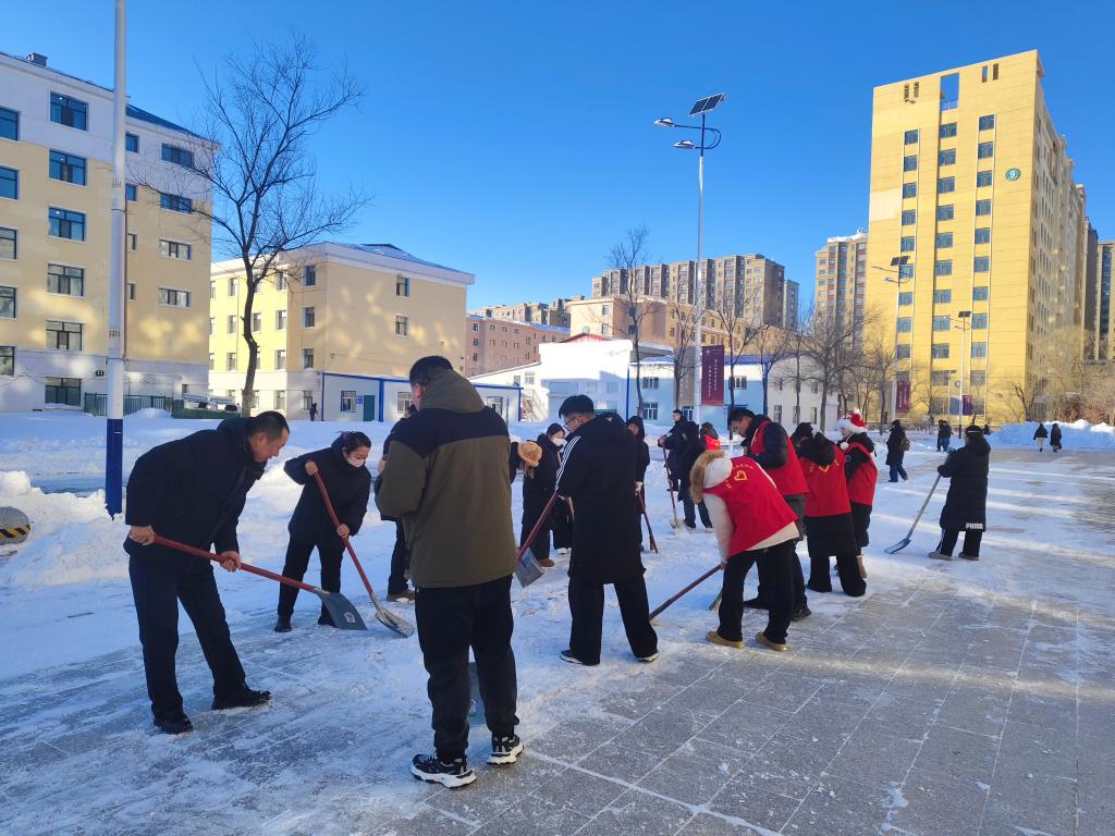 学院党委书记赵金辉、党委副书记王宏霞及辅导员带领同学们投身清雪一线。师生们手持铁锹,分工协作、默契配合,重点对崇文楼周边区域进行全面清扫。大家不畏严寒、干劲十足,铲冰除雪、清理归堆,用实际行动为师生开辟出一条条安全畅通的出行之路。